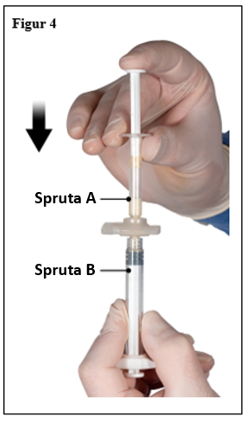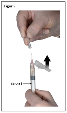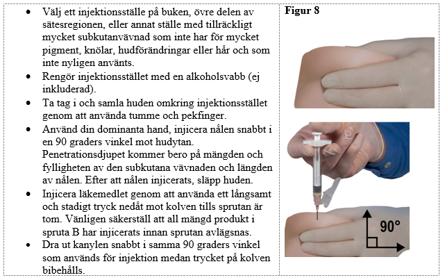 Tryck ut alla stora luftbubblor från spruta B före administrering. Administrera produkten subkutant och håll samtidigt säkerhetshöljet ifrån kanylen.
