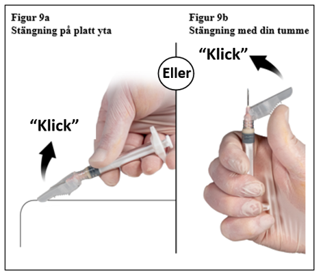 Stängning med tummen Placera tummen på säkerhetshöljet (figur 9b), täck nålspetsen och lås höljet. Säkerställ det låsta läget genom ett hörbart och distinkt ”klick”. Låst läge kommer att fullständigt täcka nålspetsen.