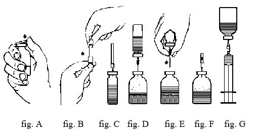Separera de två flaskorna genom att dra ut nålen ur pulverflaskan (fig. E). Skaka eller rotera pulverflaskan försiktigt för att påskynda upplösningen.