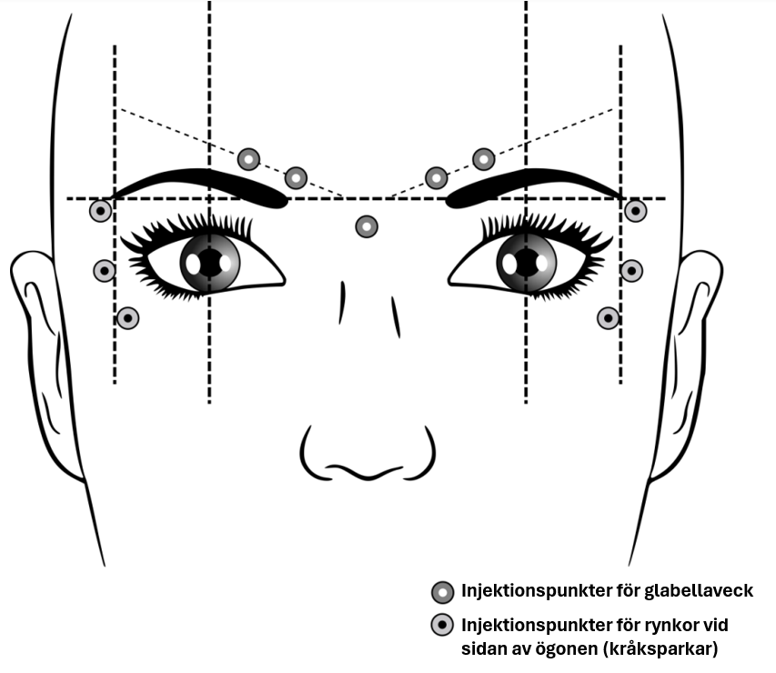 Rekommenderade injektionspunkter för glabellaveck och för rynkor vid sidan av ögonen (kråksparkar) visas nedan:
