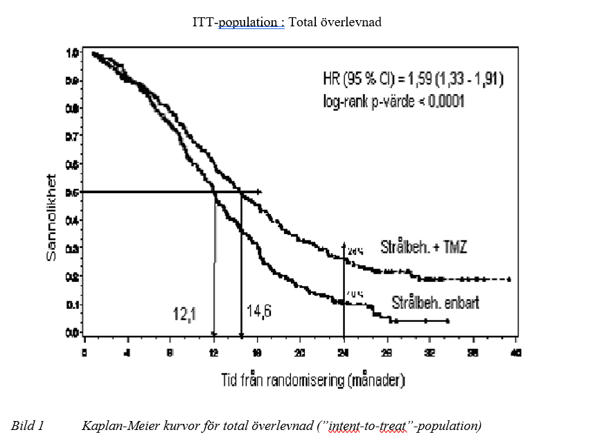 Hazard ratio (HR) för total överlevnad var 1,59 (95 % CI för HR=1,33 - 1,91), log-rank p < 0,0001 med fördel för TMZ-armen. Den uppskattade sannolikheten att överleva 2 år eller mer (26 % vs 10 %) är högre för armen med strålbehandling + TMZ. Tillägg av samtidig TMZ till strålbehandling följt av TMZ som monoterapi vid behandlingen av patienter med nydiagnostiserad glioblastoma multiforme visade en statistiskt signifikant förbättring av den totala överlevnaden jämfört med enbart strålbehandling (bild 1).