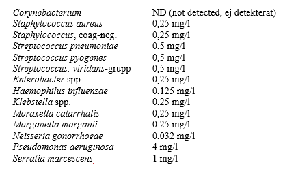 Det finns inga farmakologiska data som är korrelerade med kliniskt resultat för moxifloxacin administrerat som ett topikalt medel. Därför föreslår EUCAST (European Committe on Antimicrobial Susceptibility Testing) följande epidemiologiska brytpunkter (ECOFF mg/l) härledda från fördelningskurvor för MIC (minimal inhibitory concentration) för att indikera känslighet mot topikalt moxifloxacin: