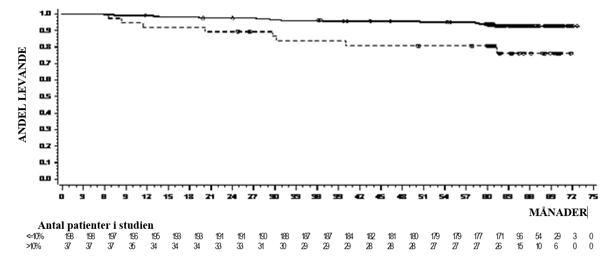 I fas I-studien med pediatriska patienter var mediandurationen för PFS 53,6 månader och OS-frekvensen 82,4% efter minst 7 års uppföljning för de 17 patienter med imatinibresistent eller -intolerant KML i kronisk fas.