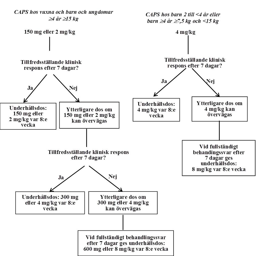 Om ett tillfredsställande kliniskt svar inte har uppnåtts 7 dagar efter behandlingsstart, kan en andra dos av kanakinumab om 150 mg eller 2 mg/kg övervägas. Om ett fullständigt behandlingssvar därefter uppnås, behöver den intensifierade doseringen om 300 mg (eller 4 mg/kg för patienter som väger ≤40 kg) var fjärde vecka bibehållas.