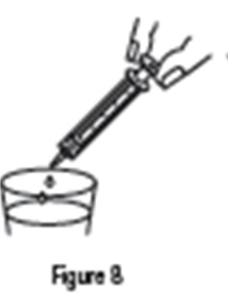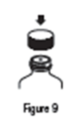 5. Skölj ur doseringssprutan och skruva på korken på flaskan (anslutningsproppen ska sitta kvar) (figur 8 och 9).