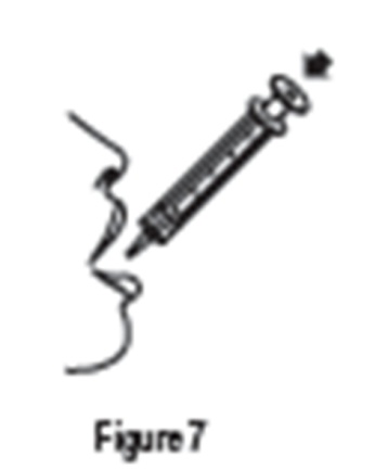 4. Spruta innehållet i doseringssprutan i munnen (figur 7). Upprepa steg 2 och 4 för att uppnå angiven dos (Tabell 3).