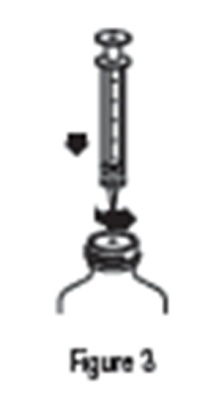 2. Sätt doseringssprutan i anslutningsproppen och dra ut angiven volym från den upp och nedvända flaskan (figur 3 och 4).