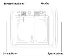 Flerkammarpåsen är förpackad i en skyddsförpackning. Mellan påsen och skyddsförpackningen finns en syreabsorbent; dospåsen av inert material innehåller järnpulver.