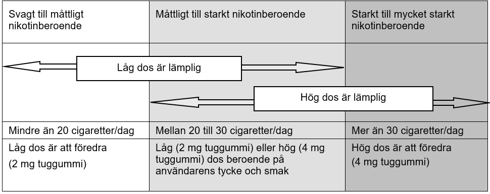 Tuggummistyrka ska väljas med utgångspunkt från nikotinberoendet. Vid högt beroende eller vid tidigare misslyckande med att sluta röka efter att ha använt 2 mg tuggummi, bör 4 mg användas. I övriga fall ska 2 mg användas.