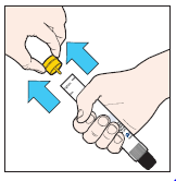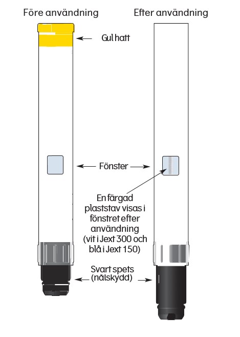 Notera: Den gula hatten förhindrar pennan från att aktiveras, och ska inte tas bort förrän det är dags att använda Jext. Sätt aldrig tummen, fingrar eller hand över den svarta spetsen (nålskyddet).