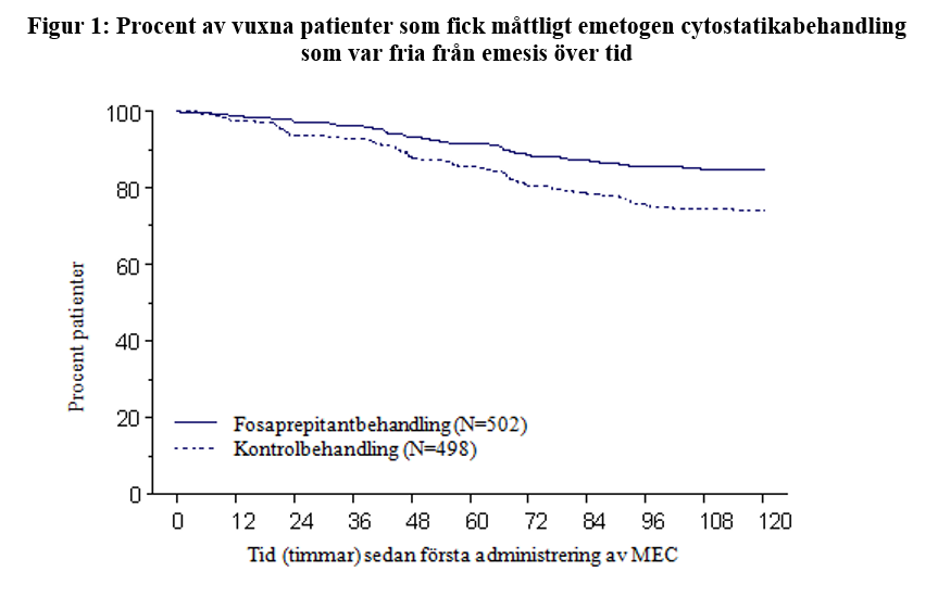 I en randomiserad, parallell, dubbelblind placebokontrollerad studie jämfördes IVEMEND 150 mg (N=502) i kombination med ondansetron och dexametason med enbart ondansetron och dexametason (kontrollbehandling) (N=498) hos vuxna patienter som fick en måttligt emetogen cytostatikabehandling. Fosaprepitantbehandlingen bestod av fosaprepitant 150 mg Dag 1 i kombination med oralt ondansetron 8 mg i 2 doser och oralt dexametason 12 mg. Dag 2 och 3 fick patienter i fosaprepitantgruppen placebo för ondansetron var 12:e timme. Kontrollbehandlingen bestod av fosaprepitantplacebo 150 mg i.v. Dag 1 i kombination med oralt ondansetron 8 mg i 2 doser och oralt dexametason 20 mg. Dag 2 och 3 fick patienter i kontrollgruppen 8 mg oralt ondansetron var 12:e timme. Fosaprepitantplacebo och dexametasonplacebo (Dag 1) användes för att upprätthålla blindning.