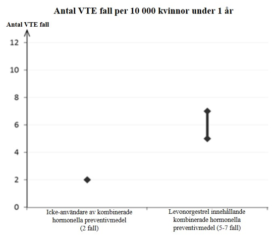 Av 10 000 kvinnor som använder kombinerade hormonella preventivmedel som innehåller levonorgestrel kommer cirka 6 kvinnor1 att utveckla en VTE under ett år.