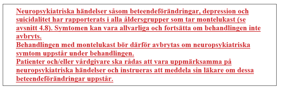 Patienter med acetylsalicylsyrakänslig astma som tar montelukast bör fortsätta att undvika acetylsalicylsyra och andra antiinflammatoriska läkemedel.