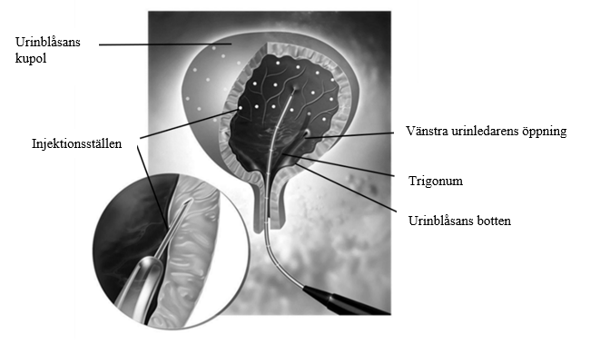 Efter intradetrusorinjektion vid behandling av neurogen detrusoröveraktivitet påverkar toxinet aktiviteten i detrusormuskelns efferenta banor genom hämning av acetylkolinfrisättningen. Dessutom kan toxinet hämma afferenta neurotransmittorer och sensoriska banor.