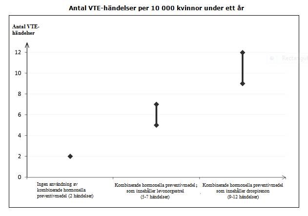 Man uppskattar1 att av 10 000 kvinnor som använder kombinerade hormonella preventivmedel innehållande drospirenon kommer mellan 9 och 12 kvinnor att utveckla en VTE under ett år; detta kan jämföras med cirka 62 kvinnor som använder kombinerade hormonella preventivmedel som innehåller levonorgestrel.
