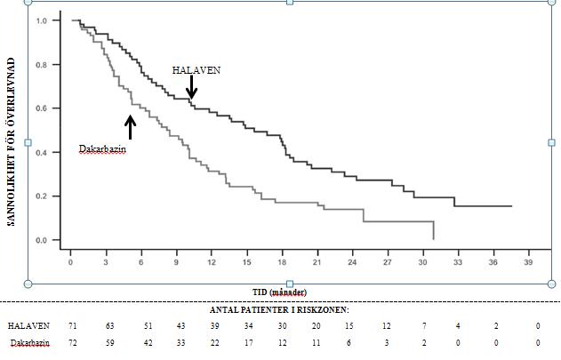 I studie 309 sågs en statistiskt signifikant förbättring av total överlevnad (OS) hos patienter som randomiserats till eribulinarmen jämfört med kontrollarmen. Detta översattes till en förbättring på 2 månader av median-OS (13,5 månader för eribulinbehandlade patienter mot 11,5 månader för dakarbazinbehandlade patienter). Det fanns ingen signifikant skillnad i progressionsfri överlevnad eller total svarsfrekvens mellan behandlingsarmarna i den totala populationen.
