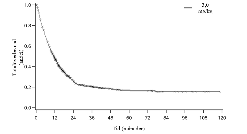 Vid en exponering-responsanalys på 497 patienter med avancerat melanom, var totalöverlevnaden oberoende av tidigare systemisk anticancerbehandling och ökade med högre plasmakoncentrationer av ipilimumab Cminss.