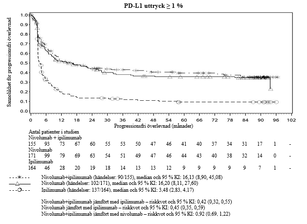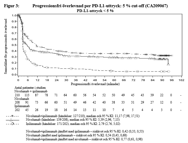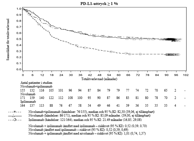 Jämfört med nivolumab monoterapi har en ökning av progressionsfri överlevnad (PFS) och totalöverlevnad (OS) med kombinationen nivolumab och ipilimumab endast visats hos patienter med lågt tumöruttryck av PD-L1 (se avsnitt Varningar och försiktighet och Farmakodynamik).
