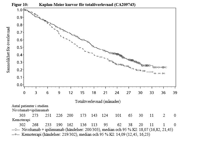 Vid en uppdaterad deskriptiv analys med en minsta uppföljningstid på 20 månader var förbättring i totalöverlevnad överensstämmande med den primära analysen. Medianvärdet för totalöverlevnad var 13,70 månader (95 % KI: 11,24, 17,41) för ipilimumab plus nivolumab jämfört med 9,07 månader (95 % KI: 7,69, 10,02) för kemoterapi (HR = 0,63; 95 % KI: 0,49, 0,82). Medianvärdet för progressionsfri överlevnad var 4,04 månader (95 % KI: 2,40, 4,93) för ipilimumab plus nivolumab jämfört med 4,44 månader (95 % KI: 2,89, 5,82) för kemoterapi (HR = 1,02; 95 % KI: 0,77, 1,34). Den objektiva responsfrekvensen var 35,4 % (95 % KI: 28,0, 43,4) för ipilimumab plus nivolumab jämfört med 19,7 % (95 % KI: 13,8, 26,8) för kemoterapi.