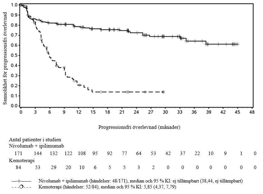 Studiens primära effektmått uppnåddes vid den planerade interimsanalysen och påvisade en statistiskt signifikant förbättring av progressionsfri överlevnad enligt BICR för patienter med centralt bekräftad MSI‑H/dMMR i armen ipilimumab i kombination med nivolumab jämfört med kemoterapiarmen. Resultaten för progressionsfri överlevnad enligt BICR visas i tabell 19 och figur 11. På grund av testhierarkin analyserades inte övriga effektmått, inklusive data från nivolumab monoterapiarmen, vid tidpunkten för interimsanalysen.