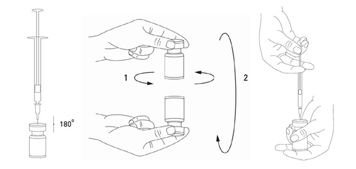 Beredning av injektionsflaskans innehåll och färdigställandet av sprutan bör ske över pappershanddukar med plastad yta för att fånga upp eventuellt spill. En lämplig mängd natriumkloridlösning (se tabell över spädningen) dras upp i en spruta. En 20‑27 gauge kort avfasad nål rekommenderas för beredning. Efter vertikalt införande av nålen genom gummiproppen ska spädningsvätskan injiceras försiktigt i injektionsflaskan för att förhindra skumbildning. Om vakuumet inte drar in spädningsvätskan i injektionsflaskan ska injektionsflaskan kasseras. Sprutan ska tas bort från injektionsflaskan och Xeomin ska blandas med spädningsvätskan genom att försiktigt snurra och vända injektionsflaskan – lösningen ska inte skakas kraftigt. Vid behov ska nålen som använts vid beredningen vara kvar i injektionsflaskan och den mängd lösning som krävs dras upp med en ny steril spruta lämplig för injektion.