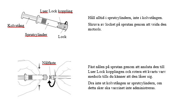 Vaccinet ska inspekteras visuellt för partiklar och missfärgning före administrering. Om några främmande partiklar och/eller variation i det fysiska utseendet observeras ska vaccinet inte administreras. Om två nålar av olika längd medföljer förpackningen ska lämplig nål väljas för att säkerställa intramuskulär administrering.