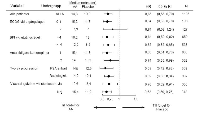 AA=ZYTIGA, BPI=Brief Pain Inventory, C.I.=konfidensintervall, ECOG=Eastern Cooperative Oncology Group Performance Score, HR=riskkvot, NE=kan ej bedömas