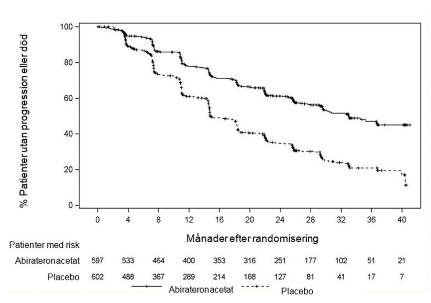 Sexhundrasju (607) patienter hade radiografisk progression eller avled: 271 (50 %) i abirateronacetatgruppen och 336 (62 %) i placebogruppen. Behandling med abirateronacetat minskade risken för radiografisk progression eller död med 47 % jämfört med placebo (riskkvot = 0,530, 95 % CI: [0,451; 0,623], p < 0,0001). Medianen för rPFS var 16,5 månader i abirateronacetatgruppen och 8,3 månader i placebogruppen.