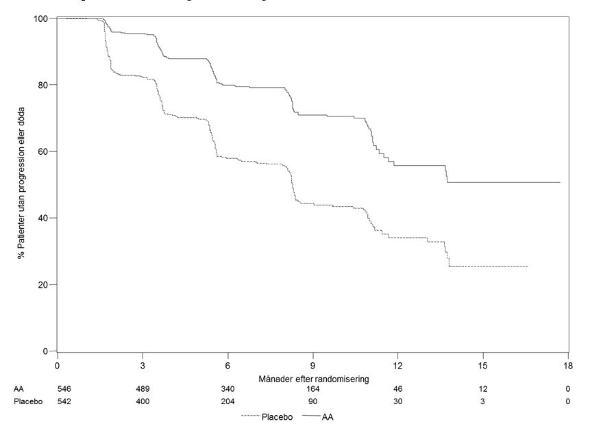Vid den planerade rPFS analysen fanns det 401 händelser, 150 (28 %) av patienterna som behandlades med ZYTIGA och 251 (46 %) av patienterna som behandlades med placebo hade radiografiska tecken på progression eller hade avlidit. En signifikant skillnad i rPFS mellan behandlingsgrupperna observerades (se tabell 4 och figur 3).