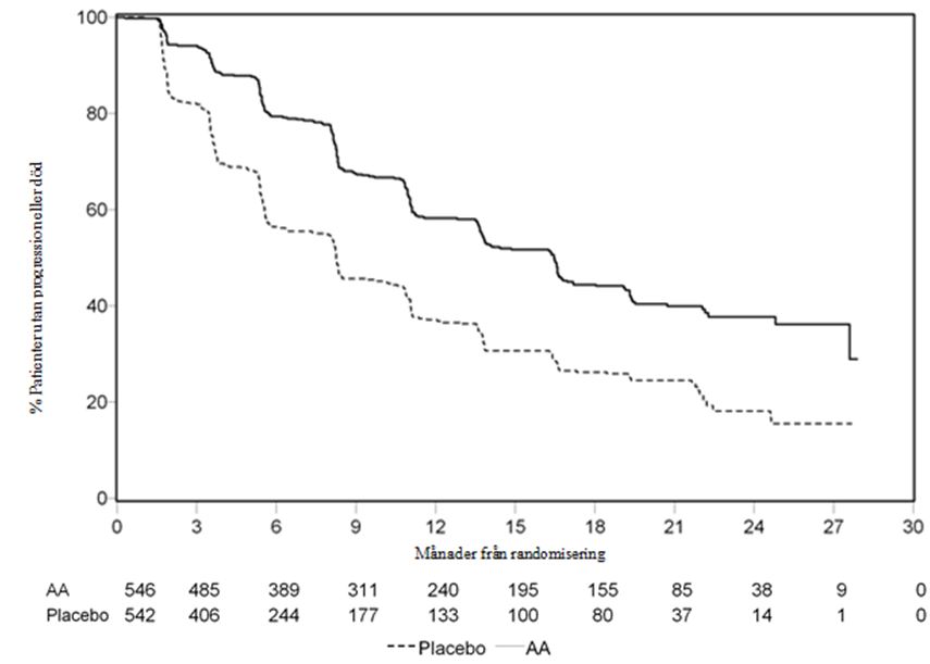 Radiografisk progressionsfri överlevnad definierades som tiden från randomisering till förekomst av radiografisk progression eller dödsfall oavsett orsak. Radiografisk progression inkluderade progression vid benskanning (enligt modifierade PCWG2-kriterier) eller progression av mjukdelslesioner vid CT eller MRT (enligt RECIST 1.1).
