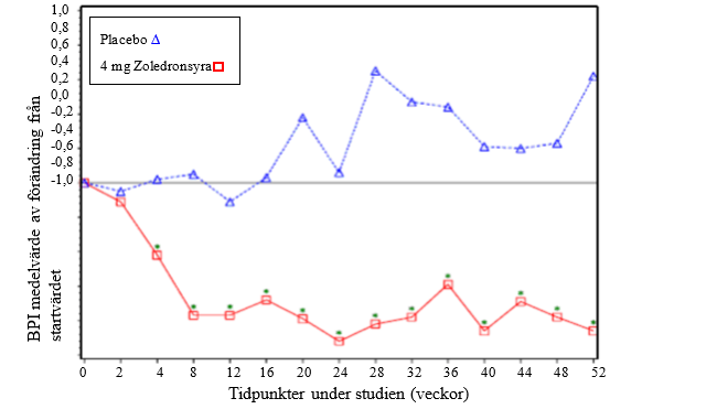 Kliniska studieresultat vid förebyggande av skelettrelaterade händelser hos patienter med avancerade benvävnadsmetastaserI den första, randomiserade, dubbelblinda, placebokontrollerade studien jämfördes zoledronsyra 4 mg med placebo vid prevention av skelettrelaterade händelser (SRE) hos prostatacancerpatienter. Zoledronsyra 4 mg reducerade signifikant andelen patienter som drabbades av åtminstone en SRE, fördröjde mediantiden till första SRE med mer än 5 månader samt minskade den årliga incidensen av händelser per patient. Analys av multipla händelser visade 36 % riskreduktion i utveckling av SRE hos gruppen som fick zoledronsyra 4 mg jämfört med placebogruppen. Patienter som fick zoledronsyra 4 mg rapporterade mindre ökning av smärta än de som fick placebo, och skillnaden nådde signifikans vid 3, 9, 21 och 24 månader. Färre patienter som fick zoledronsyra 4 mg fick patologiska frakturer. Behandlingseffekterna var mindre uttalade hos patienter med osteosklerotiska lesioner. Effektresultaten summeras i tabell 2.