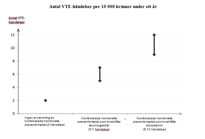 Man uppskattar1 att av 10 000 kvinnor som använder kombinerade hormonella preventivmedel innehållande drospirenon kommer mellan 9 och 12 kvinnor att utveckla en VTE under ett år; detta kan jämföras med cirka 62 kvinnor som använder kombinerade hormonella preventivmedel som innehåller levonorgestrel.