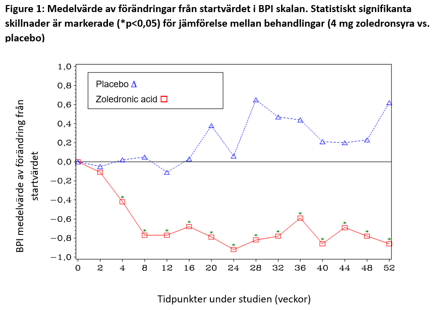 I den zoledronsyra-behandlade gruppen sågs en statistiskt signifikant förbättring i skattningen av smärta (enligt skalan Brief Pain Inventory, BPI) efter 4 veckor och vid varje efterföljande tidpunkt under studien, jämfört med i placebogruppen (figur 1). Smärtskattningen för zoledronsyra var konsekvent under startvärdet och smärtminskningen åtföljdes av en tendens till lägre skattning avseende förbrukning av smärtstillande läkemedel.