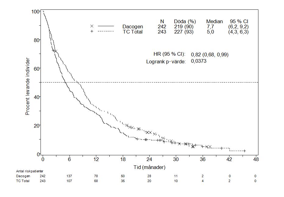 I en analys med ytterligare 1 års uppföljning visade Dacogens effekt på den totala överlevnaden en klinisk förbättring jämfört med TC-armen (7,7 månader mot respektive 5,0 månader, hazard ratio = 0,82, 95 % CI: 0,68; 0,99, nominellt p värde = 0,0373, Figur 2).