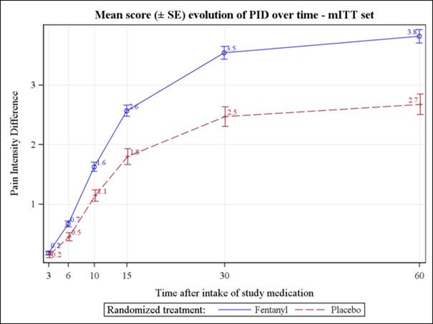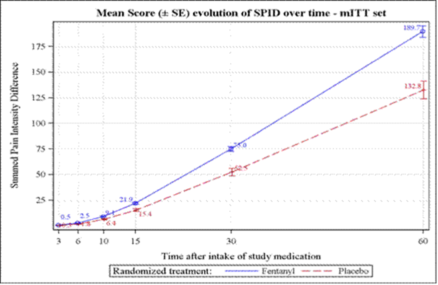 Medelvärdet för skillnader i smärtintensitet var signifikant högre för episoder med genombrottssmärta som behandlats med fentanyl än de som behandlats med placebo från 6 minuter efter administrering och till 60 minuter (respektive p=0,003 och p<0,0001) (se fig. nedan);