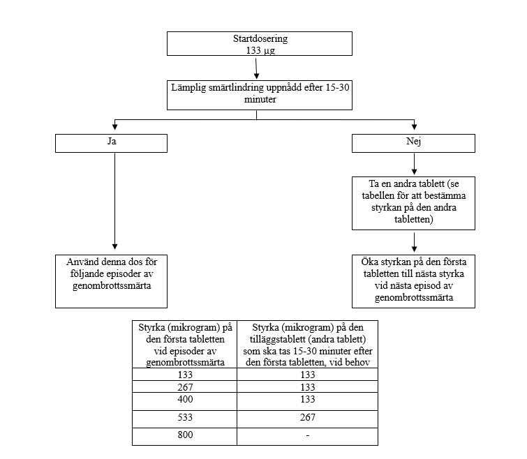 Patienter ska starta behandlingen med en enda 133 mikrograms sublingual resoriblett. Om tillräcklig smärtlindring inte uppnås efter 15-30 minuter efter att första tabletten tagits, kan ytterligare en 133 mikrograms sublingual resoriblett ges. Om behandling av en episod av genombrottssmärta kräver mer än en doseringsenhet, ska man överväga att öka dosen till nästa tillgängliga högre styrka (se nedanstående figur). Ökning av dosen ska ske steg för steg tills lämplig smärtlindring uppnåtts. Doseringsstyrkan för den tilläggstablett (andra tablett) som ges vid otillräcklig effekt ska höjas från 133 mikrogram till 267 mikrogram vid doser på 533 mikrogram. Detta framgår av nedanstående tabell. Mer än två (2) tabletter får inte användas för att behandla en episod av genombrottssmärta under titreringsfasen.