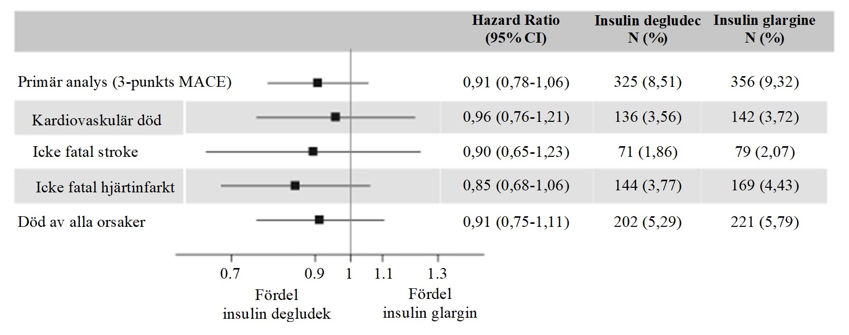 Den primära analysen var tid från randomisering till första inträffade 3-komponent större negativa kardiovaskulära händelse (Major Adverse Cardiovascular Events, MACE) definierad som kardiovaskulär död, icke-fatal hjärtinfarkt eller icke-fatal stroke. Prövningen var designad som en non-inferiority prövning för att utesluta en förspecificerad riskmarginal på 1,3 för MACE hazardkvot (HR) när Tresiba jämfördes med insulin glargin. Den kardiovaskulära säkerheten för Tresiba jämfört med insulin glargin bekräftades (HR 0,91 [0,78; 1,06]) (Bild 2).