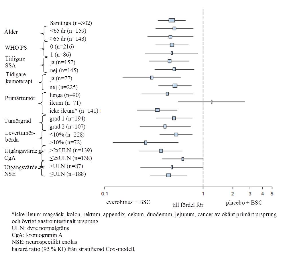 I understödjande analyser observerades en positiv behandlingseffekt i alla subgrupper med undantag för subgruppen som hade primärtumör med ursprung i ileum (ileum: HR=1,22 [95 % KI: 0,56‑2,65], icke ileum: HR=0,34 [95 % KI: 0,22‑0,54], lunga: HR=0,43 [95 % KI: 0,24‑0,79]) (se figur 5).