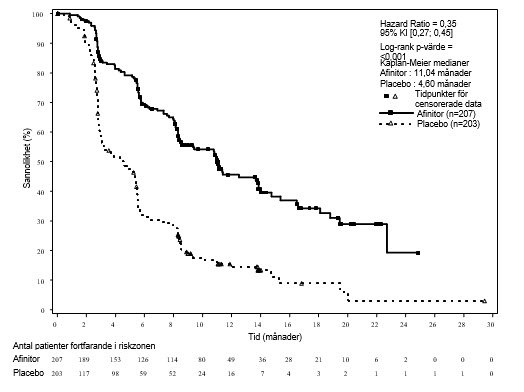 Afinitor var överlägset placebo vad avser primärt effektmått av progressionsfri överlevnad, med en statistiskt signifikant, 67 %, minskning av risken för progression eller dödsfall (se Tabell 7 och Figur 6).