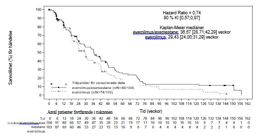 Resultatet för det sekundära effektmåttet total överlevnad var emellertid inte i överensstämmelse med det primära effektmåttet PFS och indikerade en fördel för enbart everolimus. Beräknad HR var 1,27 (90 % KI: 0,95; 1,70) för jämförelsen av total överlevnad hos gruppen som enbart fick everolimus respektive everolimus + exemestan. Beräknad HR för total överlevnad i gruppen som fick everolimus plus exemestan jämfört med kapecitabin var 1,33 (90 % KI: 0,99; 1,79).