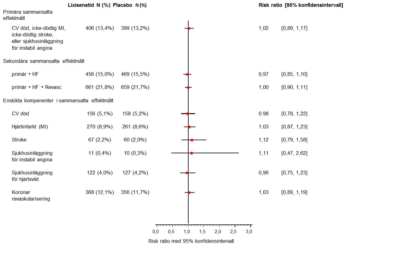 En dubbelblind, placebokontrollerad studie angående kardiovaskulära effekter (ELIXA) inkluderade dessutom 6068 patienter med typ 2-diabetes och tidigare akut koronarsyndrom (3034 randomiserade till lixisenatid, inklusive 198 patienter ≥ 75 år gamla och 655 patienter med måttligt nedsatt njurfunktion).