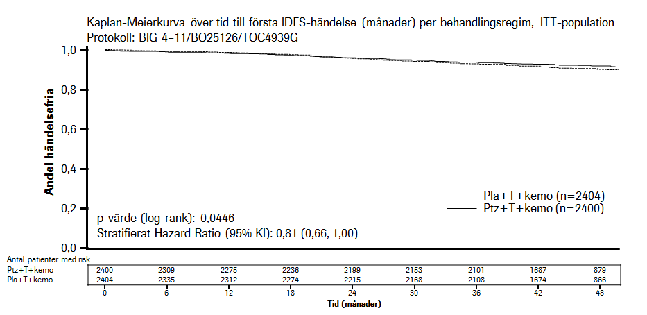 Estimatet av IDFS vid 4 år var 92,3% i gruppen behandlade med Perjeta jämfört med 90,6% i gruppen behandlade med placebo. Vid tidpunkten för estimatet var median uppföljningstid 45,4 månader.
