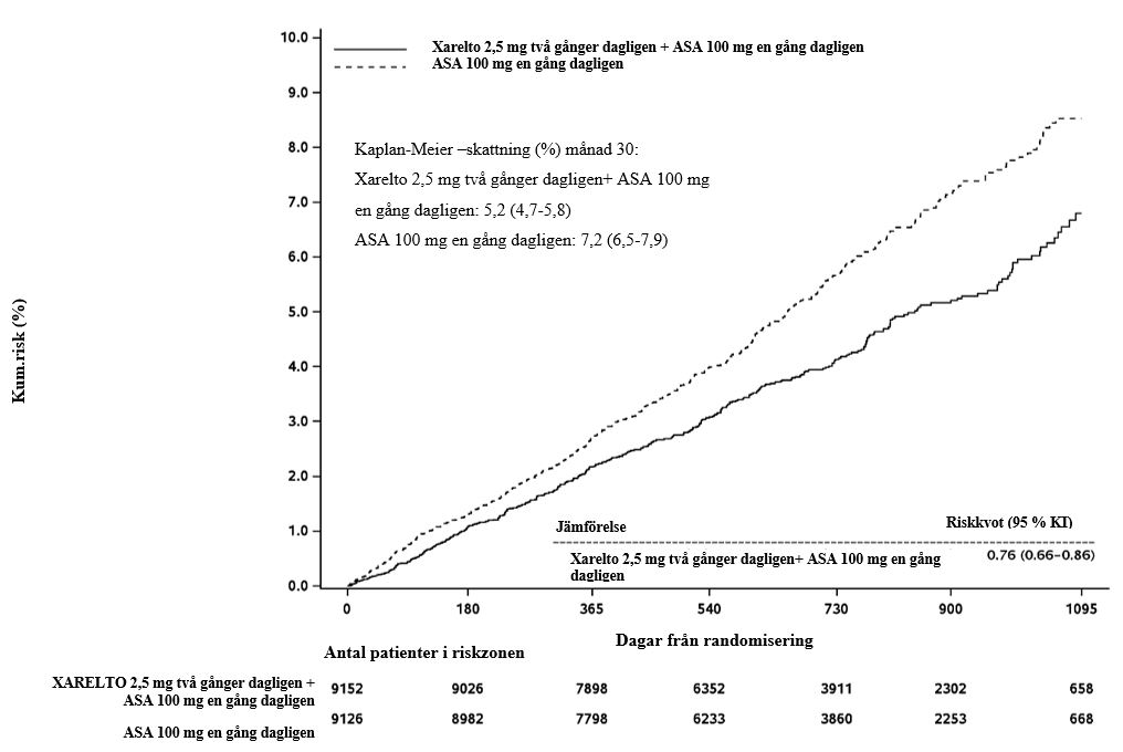 Den primära effektanalysen (d.v.s. dödsorsak oavsett orsak, hjärtinfarkt, eller stroke) visade ingen signifikant statistisk skillnad mellan gruppen som fick rivaroxaban 2,5 mg två gånger dagligen och placebo med riskkvot=0,94 (95 % KI 0,84 – 1,05), p=0.270. För dödsorsakoavsett orsak var det ingen skillnad mellan rivaroxaban och placebo i antal händelser (frekvensen av händelser per 100 patient-år; 11,41 jämfört med 11,63, riskkvot: 0,98; 95 % KI: 0,87 till 1,10; p=0.743). Frekvensen av händelser av hjärtinfarkter per 100 patient-år (rivaroxaban jämfört med placebo) var 2,08 jämfört med 2,52 (riskkvot 0,83; 95 % KI: 0,63 till 1,08; p=0.165) och för stroke var frekvensen av händelser per 100 patient-år 1,08 jämfört med 1,62 (riskkvot: 0,66; 95 % KI: 0,47 till 0,95; p=0,023). Det primära säkerhetsmåttet (d.v.s. blödning med dödlig utgång eller blödning i ett kritiskt organ med risk för permanent funktionsnedsättning), inträffade hos 18 (0,7 %) patienter i gruppen med rivaroxaban 2,5 mg två gånger daglien respektive 23 (0,9 %) av patienterna i placebogruppen (riskkvot=0,80; 95 % KI 0,43 – 1,49; p=0.484). Det var en statistisk signifikant ökning av allvarliga blödningar enligt ISTH-kriterier i rivaroxabangruppen jämfört med placebo (frekvensen av händelser per 100 patient-år: 2,04 jämfört med 1,21, riskkvot 1,68; 95 % KI: 1,18 to 2,39; p=0.003).