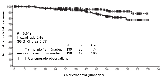 Dessutom förlängde 36-månaders behandling med imatinib signifikant den totala överlevnaden (OS) jämfört med 12-månaders behandling med imatinib (HR = 0,45 [0,22-0,89], p=0,0187) (Tabell 8, Figur 2).