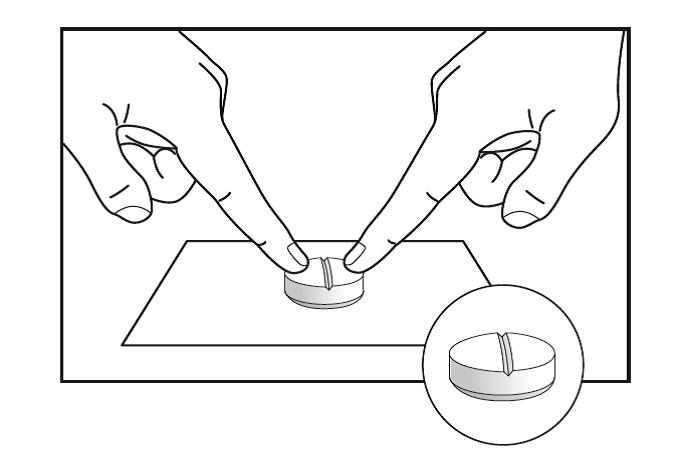 Lägg tabletten på en hård, slät yta (såsom en bordsskiva eller tallrik) med brytskåran uppåt. Tryck sedan samtidigt med båda dina pekfingrar (eller tummar) snabbt och hårt på de yttre kanterna till vänster och höger om brytskåran såsom visas i bilden nedan.