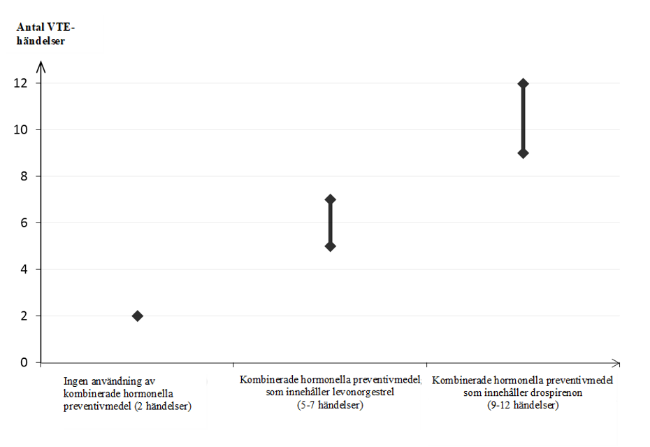 Man uppskattar1 att av 10 000 kvinnor som använder kombinerade hormonella preventivmedel innehållande drospirenon kommer mellan 9 och 12 kvinnor att utveckla en VTE under ett år; detta kan jämföras med cirka 62 kvinnor som använder kombinerade hormonella preventivmedel som innehåller levonorgestrel.
