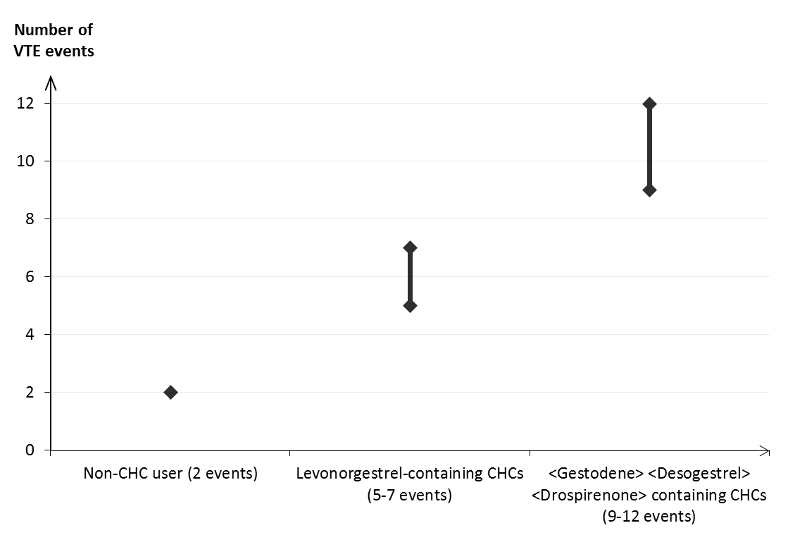 Man uppskatta1 att av 10 000 kvinnor som använder kombinerade hormonella preventivmedel innehållande drospirenon kommer mellan 9 och 12 kvinnor att utveckla en VTE under ett år; detta kan jämföras med cirka 62 kvinnor som använder kombinerade hormonella preventivmedel som innehåller levonorgestrel.