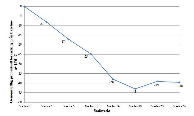 Av de 23 patienter som genomgick behandlingen till och med vecka 78 hade 19 (83 procent) LDL-C- reduceringar ≥25 procent där 8 (35 procent) hade LDL-C <100 mg/dl och 1 hade LDL-C <70 mg/dl vid denna tidpunkt.