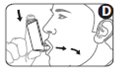 6. Andas in genom munnen. Just som du börjar andas in, tryck ned toppen av behållaren för att spraya en dos. Fortsätt att andas lugnt och djupt (bild D).