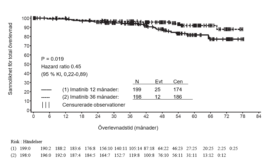Dessutom förlängde 36‑månaders behandling med imatinib signifikant den totala överlevnaden (OS) jämfört med 12‑månaders behandling med imatinib (HR = 0,45 [0,22-0,89], p=0,0187) (Tabell 8,
